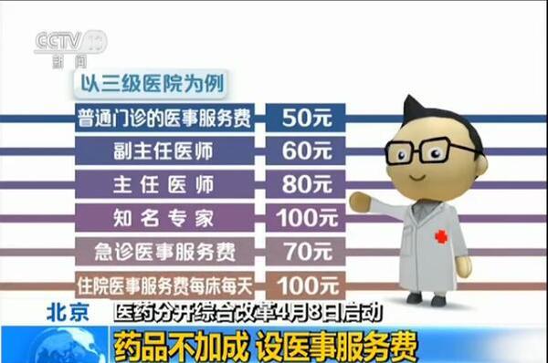 所有在京公立医疗机构全部取消15%的药品加成,实施零差率销售,取消挂号费、诊疗费,设立医事服务费。以三级医院为例,普通门诊的医事服务费50元、副主任医师60元、主任医师80元、知名专家100元、急诊医事服务费70元,住院医事服务费每床每天100元。医事服务费整体纳入城镇职工基本医疗保险、城乡居民基本医疗保险、生育保险和工伤保险报销范围内。
