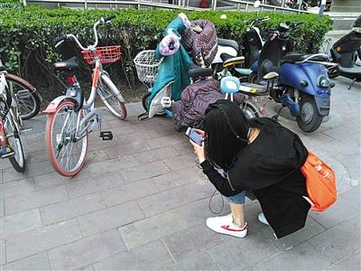 4月2日,海淀某小区,北京共享单车猎人海燕举报小区内“违停”情况。新京报记者 卢通 摄