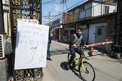 4月12日,朝阳区崔各庄南皋村,村里在五个村口都设立了警示牌,并要求安保24小时轮岗值班,禁止共享单车进村。