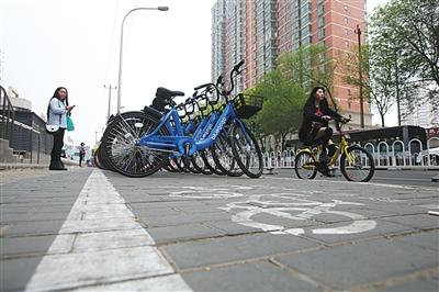 4月17日,蒲黄榆地铁站口,共享单车专用停车位,市民可将单车停放在这里。