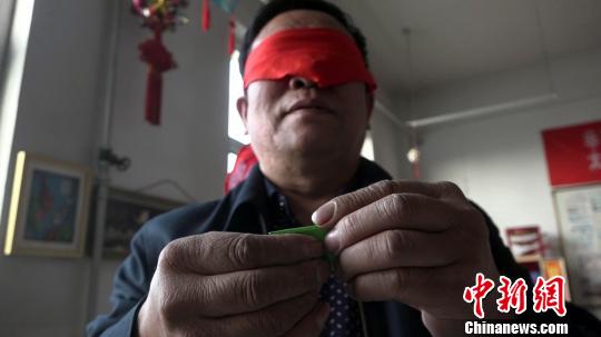 董现坤拿起一根红领巾,蒙住眼睛,手拿一片正方形彩纸,不到一分钟,一只小鸽子在他粗糙的大手中呼之欲出。 屈丽霞 摄