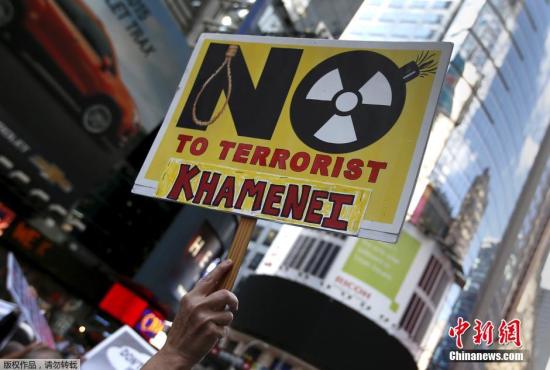 资料图:图为美国群众高举抗议伊朗核协议的图板。