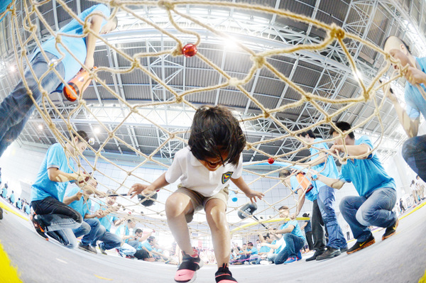 启动仪式上,来自明天幼稚集团的300名儿童与自己的爸爸一起游戏。《快乐毛毛虫》游戏,爸爸们通力合作,运送坐在“毛毛虫”身上的孩子们;《穿越封锁线》游戏,爸爸们用细绳和网布制造障碍,孩子们需要手脑并用穿越“封锁”;《箱子大战》游戏,红、蓝两个阵营的孩子不停翻转地上的箱子,将涂有自己方队颜色的一面转到最上面,随后孩子们退出,爸爸们开始比赛。