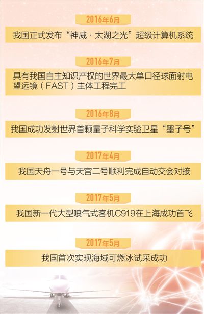一批“叫得响、数得着”的重大科技成果惊艳全球——世界最大单口径球面射电望远镜(FAST)主体工程完工,世界首颗量子科学实验卫星“墨子号”成功发射,天舟一号货运飞船与天宫二号空间实验室顺利完成自动交会对接,第一架国产商用大飞机试飞成功……