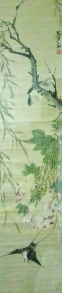 《芙蓉春燕图》,墨笔纸本高92.5厘米,宽20.05厘米。大凡传统中国花鸟画中之主象有二,动物和植物,植物之花草树木和动物中飞禽走兽在画面中都有特殊含义,此幅画作右上约三分之二处向左上角用浓淡墨斜出一枝柳树,柳树有惜别、依依不舍之意,柳树枝条下垂,与右边低垂的芙蓉遥相呼应,而芙蓉在春天开放又象征富贵吉祥。柳树的放,再由柳树枝条的收,枝条又与芙蓉形成回转之势,栖息在柳树上的燕子探头俯视画面下部,另一只燕子虽然俯冲向下,但仍有昂首向上趋势,上下两只燕子,一静一动,一呼一应,一放一收,顾盼生情,惟妙惟肖。自古以来燕子具有报春之意,即春天的使者,整幅画面设色清雅,草绿色的叶子之间穿插粗细浓淡墨线,乱中有序,用白粉画出芙蓉花的底色,浓粉线勾出花瓣,略施胭脂,浓墨点蕊如画龙点睛,彰显精气神采。画面饱满精致,布局灵活精巧,借助春天燕子、芙蓉、柳树,表达人们珍惜美好时光,实乃梦白先生之精神向往。