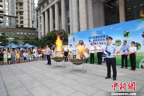 “点火!”一声令下,升腾的火焰吞噬了数十个象征着毒品和精神药物的纸箱。据悉,广州海关近年来缴获的2.26吨毒品和精神药物将于6月26日“国际禁毒日”当天进行无害化集中销毁。