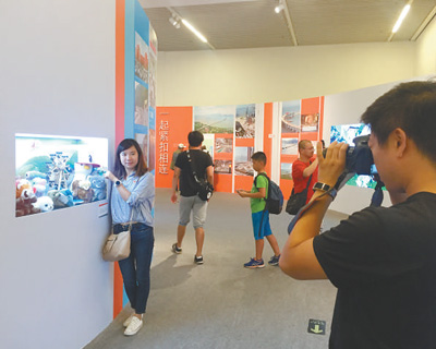 观众与展厅内陈列的公仔合影。记者 冯学知摄