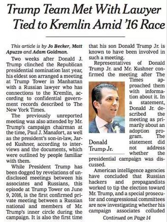 《纽约时报》上周末称,去年,“在有人承诺向川普大儿子提供希拉里·克林顿的黑材料后,他同意和一名与克里姆林宫有联系的俄罗斯律师会面”。