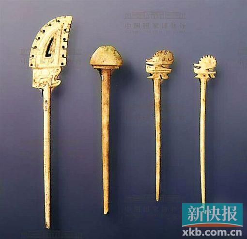 骨笄 商后期 1976年河南省安阳市殷墟妇好墓出土。此批骨笄共出土499件,大多数发现在一木匣内,有的零散放置,有的成束放置,有的平放或侧放。大量骨笄已严重残碎,按其不同笄头,可分为夔形头、鸟形头、圆盖形头、方牌形头、鸡形头、四阿屋顶形头6种。