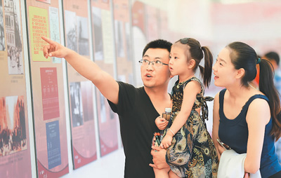图为一对年轻夫妇带着女儿参观展览。