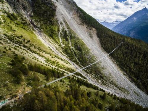 吊桥位于瑞士最高峰多姆峰一座山谷上,全长1620英尺(约493米),与山谷底部最大垂直距离为278英尺(约85米),连接瑞士山区小镇采尔马特及格雷兴。