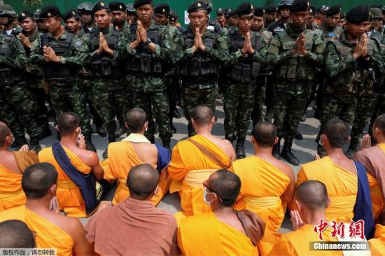 资料图:3月9日,泰国军方和警方出动多名工作人员试图进入法身寺搜查,超过众多僧侣站在桥上组成“人墙”,阻止工作人员进入。