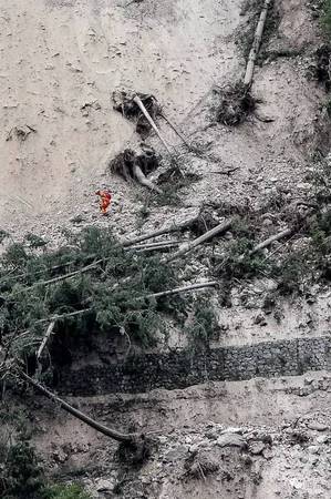 下图为一架载有两名伤员的救援直升机在熊猫海起飞,直升机飞行过程中,旁边的塌方区正在余震的作用下不断垮塌↓