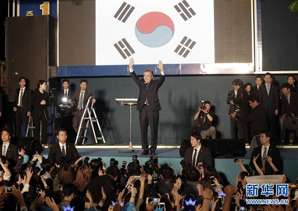5月10日,文在寅(中)在韩国首尔向支持者致意。韩国中央选举管理委员会10日凌晨发布的计票数据显示,共同民主党候选人文在寅确认在第19届总统选举中获胜,当选新一任总统。