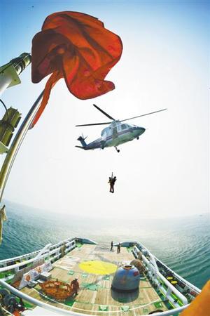 21日,我国首次在真实海域开展的航天员海上救生训练任务圆满完成。16名中国航天员和2名欧洲航天员完成了海上自主出舱、海上生存、海上搜救船救援及海上直升机悬吊营救等科目。朱九通摄