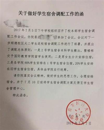 南方医科大学总务处发布的函提及“男女分片安排住宿”。