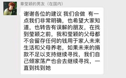 这位同学给法制晚报·看法新闻记者发来了章莹颖男友侯霄霖在志愿者群里对于此事的一个回应。侯霄霖表示,“在找到莹颖之前,我和莹颖的父母都不会留存任何的钱用于家人未来生活和父母养老。如果未来的捐款不足以支持继续寻找,我们自己倾家荡产也会去继续寻找,一直到找到她为止。”