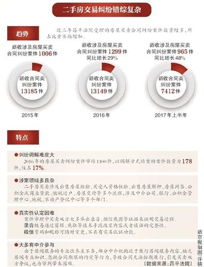 据昌平法院统计,2015年至2017年上半年,昌平新收合同类纠纷案件数量分别为13185件、13149件、7412件。其中涉及房屋买卖合同纠纷案件的情况为:2015年新收案件1006件,占合同类纠纷案件总数的比重为7.6%;2016年新收案件1299件,案件数量同比增长29%,占合同类纠纷案件总数比重为9.9%;2017年上半年新收案件965件,较2016年同期增长48%,占合同类纠纷案件总数的比重为13%。