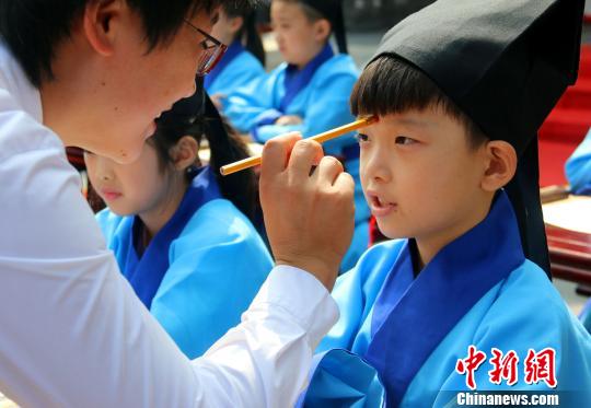 行礼结束,现场师长为小学生们“朱砂启智”,用朱砂在额头正中点上红痣,意为开启智慧。小学生击鼓明志,以示从今启蒙。一方砚台,一支毛笔,一张宣纸,他们认真书写方方正正的“人”字,寓意人生启蒙阶段,领悟做人道理最为重要。