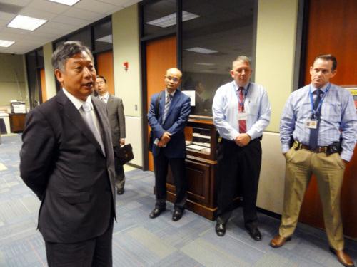 李强民(左)从休斯敦飞到亚特兰大对李案表达关切,并与警方交涉案情,右起为警探瑞奇、警督布鲁克、休斯敦领事葛明本、参赞周振成。(美国《世界日报》/吴炳宏 摄)