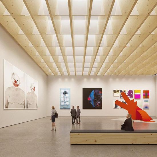 木片墙穿插在玻璃外立面中整齐排列,每片木头之间仅间隔 1.2 米,它们可以过滤阳光,为展览空间创造绝佳的光线。针对展览的不同光线需求,展廊中还设有金属格栅和可调节百叶窗,可以有效控制光线。