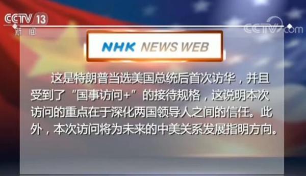 日本广播协会(NHK)网站报道称,这是特朗普当选美国总统后首次访华,并且受到了“国事访问+”的接待规格,这说明本次访问的重点在于深化两国领导人之间的信任。此外,本次访问将为未来的中美关系发展指明方向。