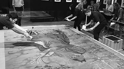 修复工作的第一步是对画作进行清洗工作,这幅画的画心长约3.78米,宽2.56米,算上装裱长将近5米,宽近3米。由于尺幅相当大,两位修复师必须分区进行清洗工作,上面用刷子蘸水冲洗,下面用小抽气板连同脏物等一同吸下去。每个区域清洗两到三次,与此同时,修复师用过滤水和吸水纸将霉迹从表面去除。