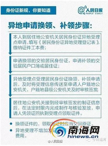 人民日报关于异地换领、补领身份证的步骤图解,其中提到“申领补领的,交验居民户口簿或居住证”。