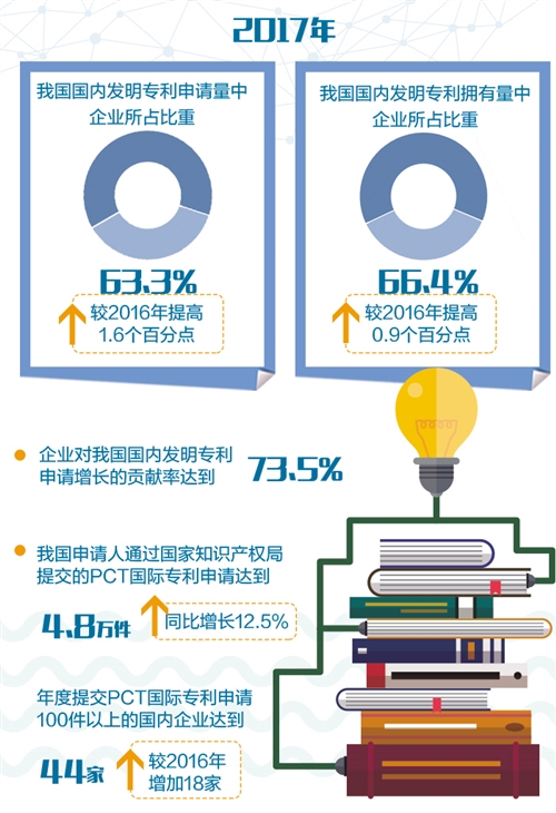 近日,国家知识产权局在北京发布了2017年我国发明专利相关情况,中国企业利用专利合作条约(PCT)加快专利布局,为自身走向国际市场打造“不坏金身”。数据显示,2017年我国申请人通过国家知识产权局提交的PCT国际专利申请达到4.8万件,同比增长12.5%,年度提交PCT国际专利申请100件以上的国内企业达到44家,较2016年增加18家。