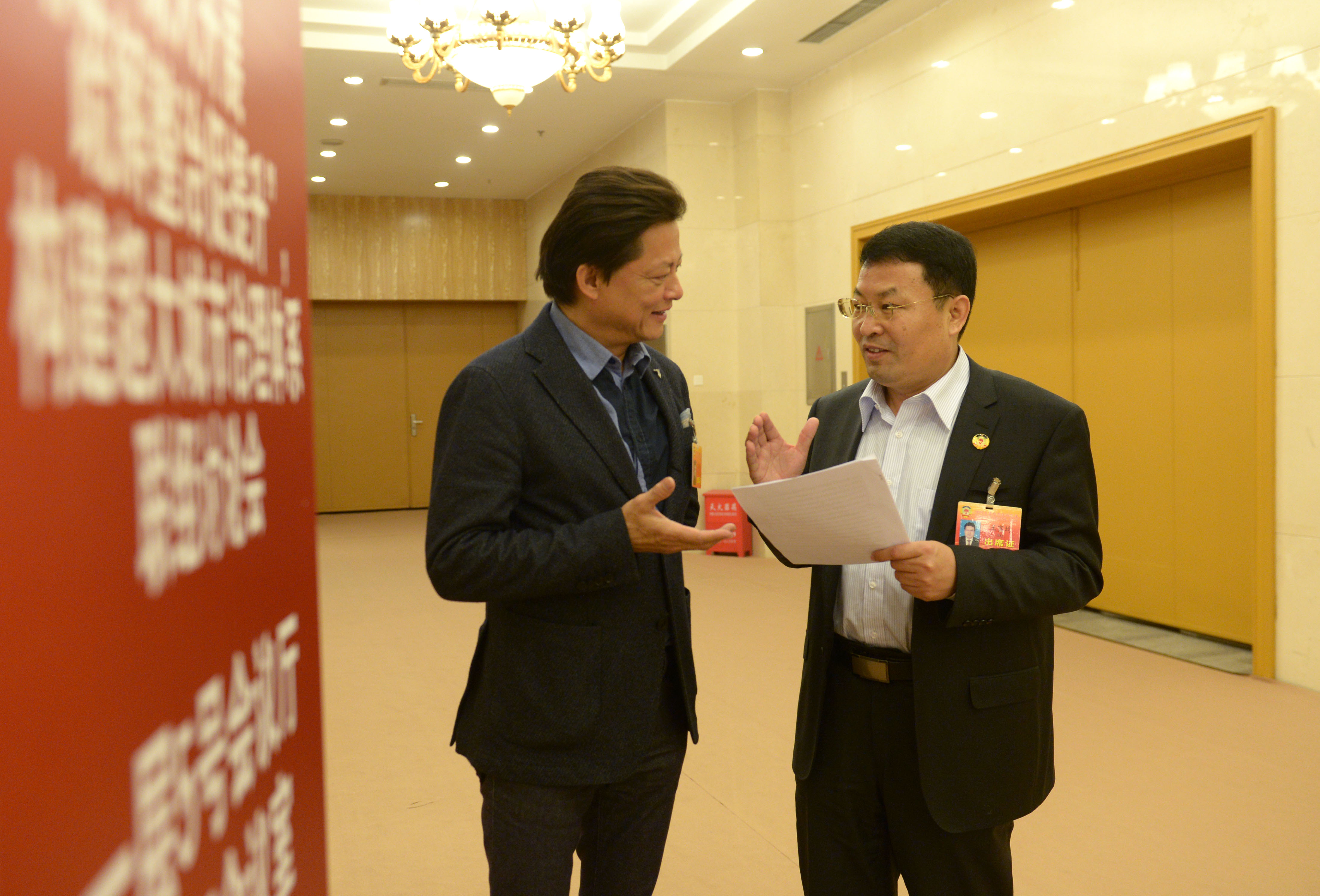 二十七日在政协北京市第十三届委员会第一次会议间隙,王富均委员(右)与莫华伦委员就“推进丽泽金融商务区开发建设,促进城市南部地区加快发展”的话题交换意见。人民政协报记者齐波摄