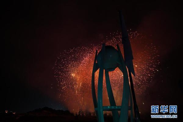 2月25日,2018年平昌冬奥会闭幕式在平昌奥林匹克体育场举行。 图为主火炬和闭幕式上的焰火表演。 新华社记者费茂华摄