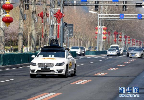 3月22日,一辆自动驾驶测试车行驶在位于北京经济技术开发区的开放测试道路上。新华社记者 罗晓光 摄