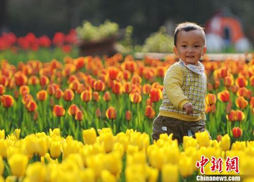 3月22日,小朋友在江西九江市濂溪区的九江新湖郁金香花博会现场玩耍。据了解,为期15天的江西九江濂溪区第七届郁金香花博会将于3月24日正式开幕,从荷兰引进的15个品种20万多株郁金香向游客和市民展出。