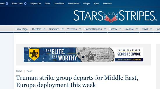 《星条旗报》9日发布消息称:“以杜鲁门号航空母舰为首的战斗群4月11号将离开弗吉尼亚州诺福克海军基地前往欧洲和地中海执行部署任务”。