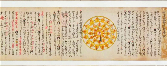 上图的经卷,详细记录了阿吒力密法关于大自在随求佛母、毗卢遮那佛等诸佛、菩萨、金刚的启请文和仪轨,还用朱砂标注了梵文咒语,绘制有法界轮和金刚曼陀罗等,内容庞大而关翔实。此件有大理国第十六位国王段正严“保天八年”纪年的,长达33米的经卷为我们了解大理国阿吒力教提供了罕见的实物资料,非常珍贵。