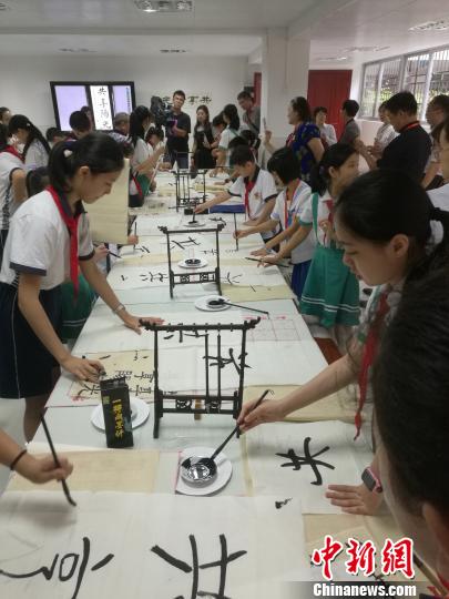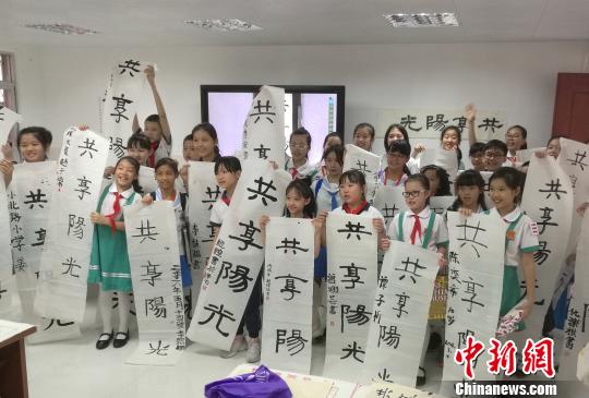 台南宝仁小学和广州小北路小学同学展示书法作品 郭军 摄
