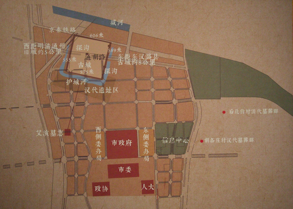 2016年开始的考古挖掘也发现了路县故城遗址。因为配合北京副中心的建设而进行了大规模考古发掘,发现了路县故城,这一工作被评为当年的十大考古发现,这部分展出副中心考古出土的汉代文物。第二小节展示晋代至唐代的通州。这部分实际上是汉代的延续,通州作为中原政权边陲重镇幽州的辅县,与幽州城命运紧密相连。展品不多,主要是晋代墓葬和唐代墓葬文物。