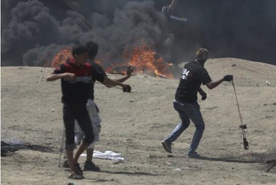 巴勒斯坦抗议民众14日向以色列军队扔石头