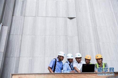 4月27日,黄松源(中)在深圳平安金融中心南塔内部检查空鼓情况。新华社记者毛思倩摄
