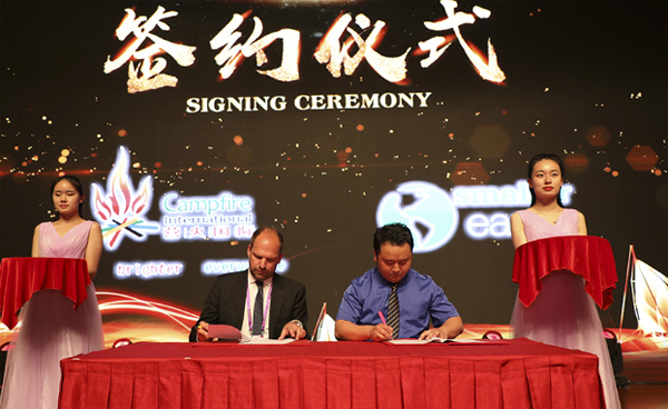 图为:《英国smaller earth 集团-营火国际合资公司》战略签约仪式