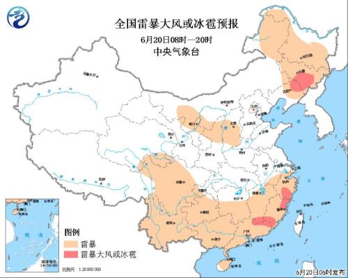 预计6月20日08时到21日08时,贵州、湖南中南部、江西、浙江、福建、广东中北部、海南东北部、云南西南部等地的部分地区将有短时强降水天气,小时雨强20-50毫米,局地可达60毫米以上;另外,内蒙古中部和东部、吉林南部、辽宁东北部、浙江南部、福建北部和南部、广东北部等地局地将有雷暴大风或冰雹天气。