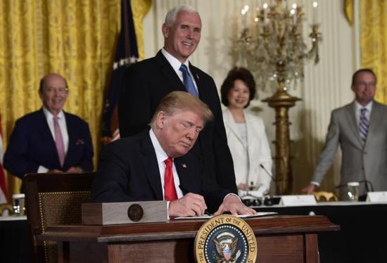 6月18日,在美国华盛顿白宫,美国总统特朗普在“国家太空委员会”会议上签署“太空政策指令-3”。 新华社 图