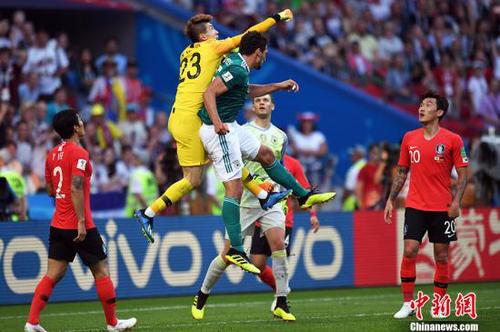第18分钟,韩国队前场获得任意球机会,郑又荣主罚直接任意球重炮攻门,德国门将诺伊尔扑球脱手,孙兴民快速插上门前包抄,但被诺伊尔抢先一步破坏出了底线。