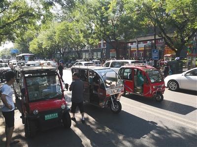 6月28日,角门北路,电动车销售店将几辆待售的老年代步车停放在路边,以躲避工商部门的禁售检查。新京报记者 王飞 摄