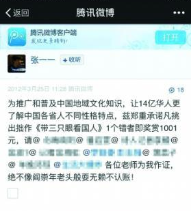 “受到电子图书和海量网络信息的冲击,纸质图书在中国的市场越来越惨淡。6年前确想宣传这本书,想让更多人知道并购买这本书传播更多地域文化知识。”张一一告诉南都记者,发布悬赏内容一定程度上是为了配合新书宣传。