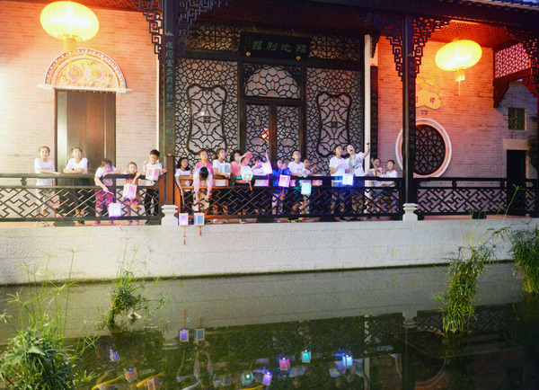 夜幕初降,园博馆室内外展园宫灯华彩,一个个小营员们手持小宫灯漫步于室内苏州展园,五折桥下锦鲤畅游,亭廊幽深投下暗影幢幢,抬头便见翘角飞檐蒙染着光晕浅浅,在老师的带领下,小营员们深深陶醉于这座江南园林的精雅秀美。