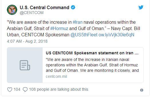 美国中央司令部发布推文称,鉴于伊朗军演预计在未来48小时内开始,美军正在密切关注事态发展。“我们意识到,伊朗增加了在霍尔木兹海峡以及阿曼湾的军事行动……我们正密切监视,并继续与我们的伙伴合作,以确保航行自由和国际商贸自由流动……我们还将继续倡导所有海上力量遵守国际海事惯例、标准和法律。”美国中央司令部发言人、海军上尉比尔·乌尔班在推特上说。