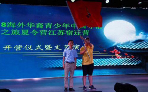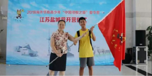 开营仪式上,江苏省侨办李红处长、盐城市外侨办董玲玲主任分别为盐中夏令营营员代表圣地亚哥华夏中文学校乐恩、市一中营员代表美国菁英学院张浩扬授旗,标志着2018海外华裔青少年“中国寻根之旅夏令营·江苏盐城营”正式开营。随后来自盐城中学和市一中的志愿者,为大家表演节目以示欢迎。