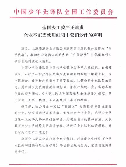 声明介绍,近日,上海臻海实业有限公司邀请日本演员苍井空作为“助学使者”,参加在云南德宏州举办的“公益活动”并佩戴红领巾事件引起网友极大愤慨。