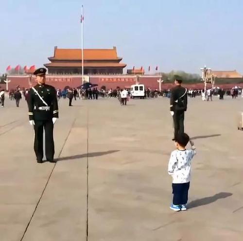 北京天安门广场上,3岁小朋友看见执勤武警战士时,庄严敬礼。